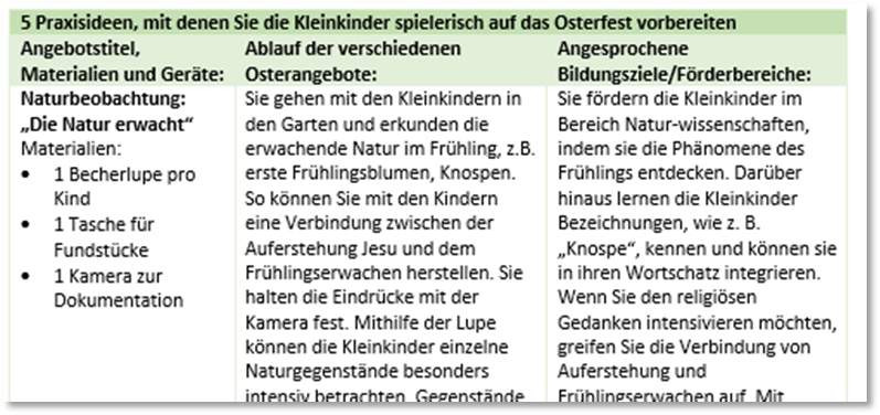 Da wir wissen, wie schwierig es für Sie manchmal sein kann, in der vorhandenen Zeit tolle Angebote für Ihre U3-Kinder zu erstellen, haben wir Ihnen diese Aufgabe abgenommen und stellen Ihnen den Ratgeber gerne GRATIS zur Verfügung. Dort finden Sie kleinkindgerechte Angebote, mit denen Sie Ihrer U3 Osterbräuche vorstellen und das Osterfest für Jedermann zu einem freudigen Erlebnis machen.